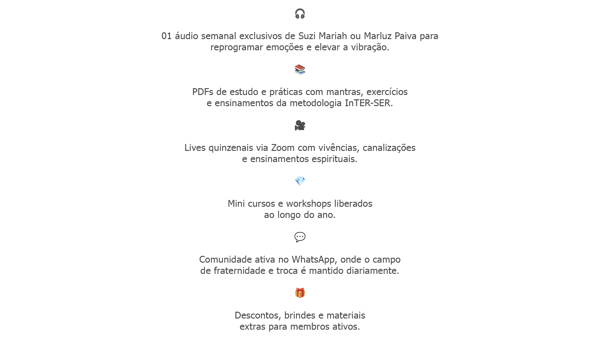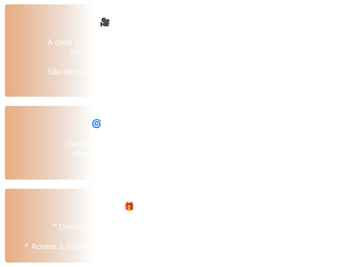 Inclui todos os conteúdos semanais, áudios de reprogramação, mensagens, lives quinzenais via Zoom, materiais em PDF, grupo ativo no WhatsApp, biblioteca digital, sorteios, descontos e ativações interdimensionais.
